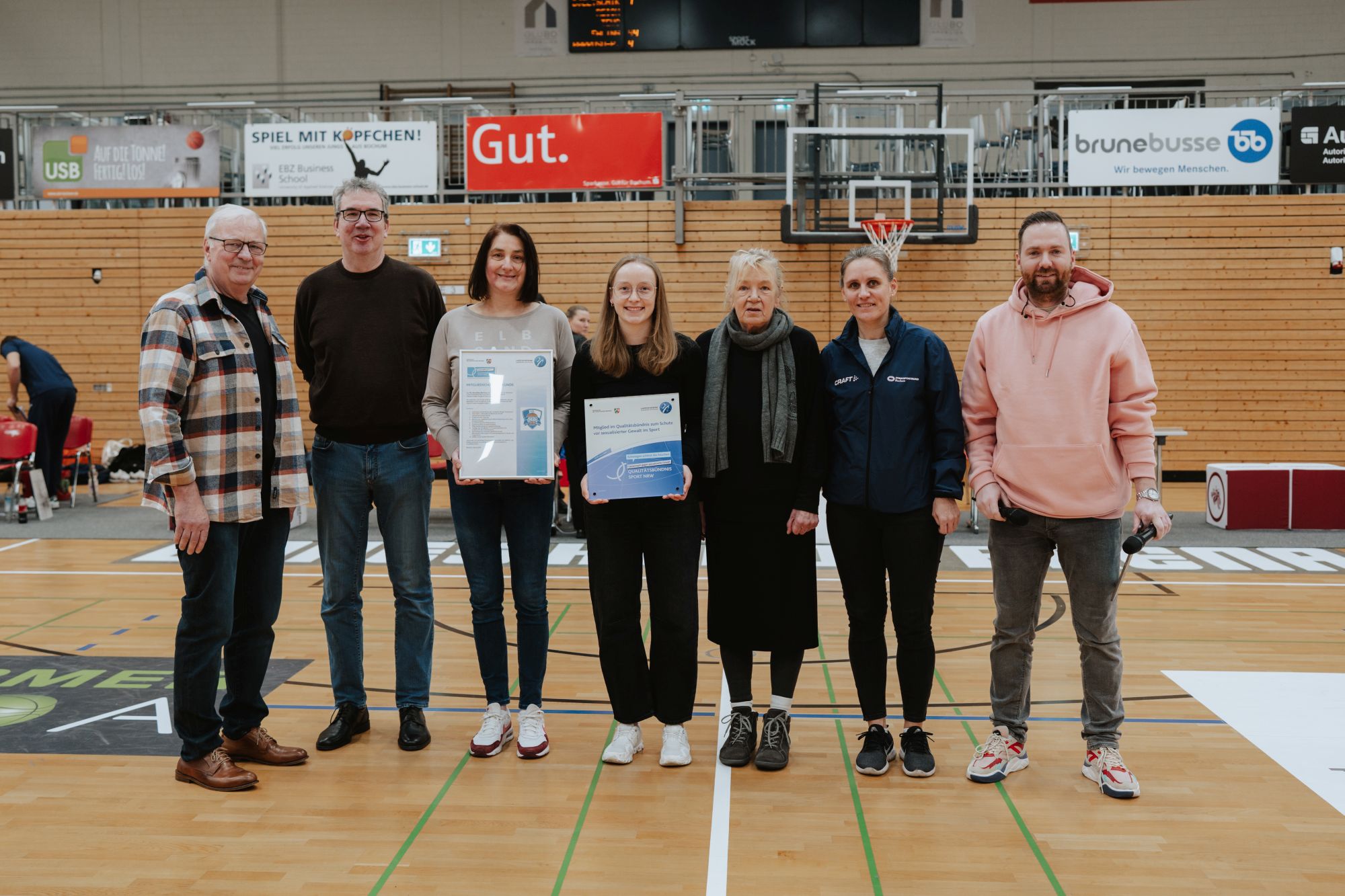 Vor dem DBBL-Spiel VfL VIACTIV-AstroLadies vs. BG89 AVIDES Hurricanes aus Rotenburg/Scheeßel am vergangenen Sonntag, 8.2.2026 wurden den VfL AstroStars Bochum Urkunde und Plakette zur Aufnahme ins „Qualitätsbündnis Sport NRW“ zum Schutz vor sexualisierter und interpersoneller Gewalt im Sport überreicht.